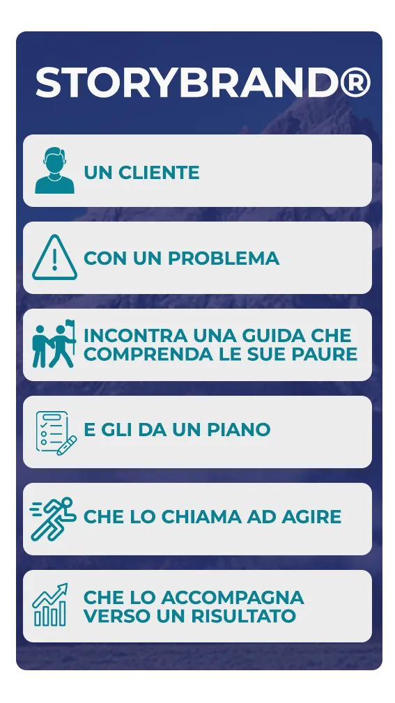 Lo StoryBrand® è un Metodo Internazionale Certificato strutturato in 7 parti per creare, comunicare e fare crescere il tuo Brand affinché i potenziali clienti scelgano la tua azienda, i tuoi prodotti e i tuoi servizi invece di scegliere i tuoi concorrenti.